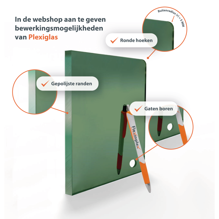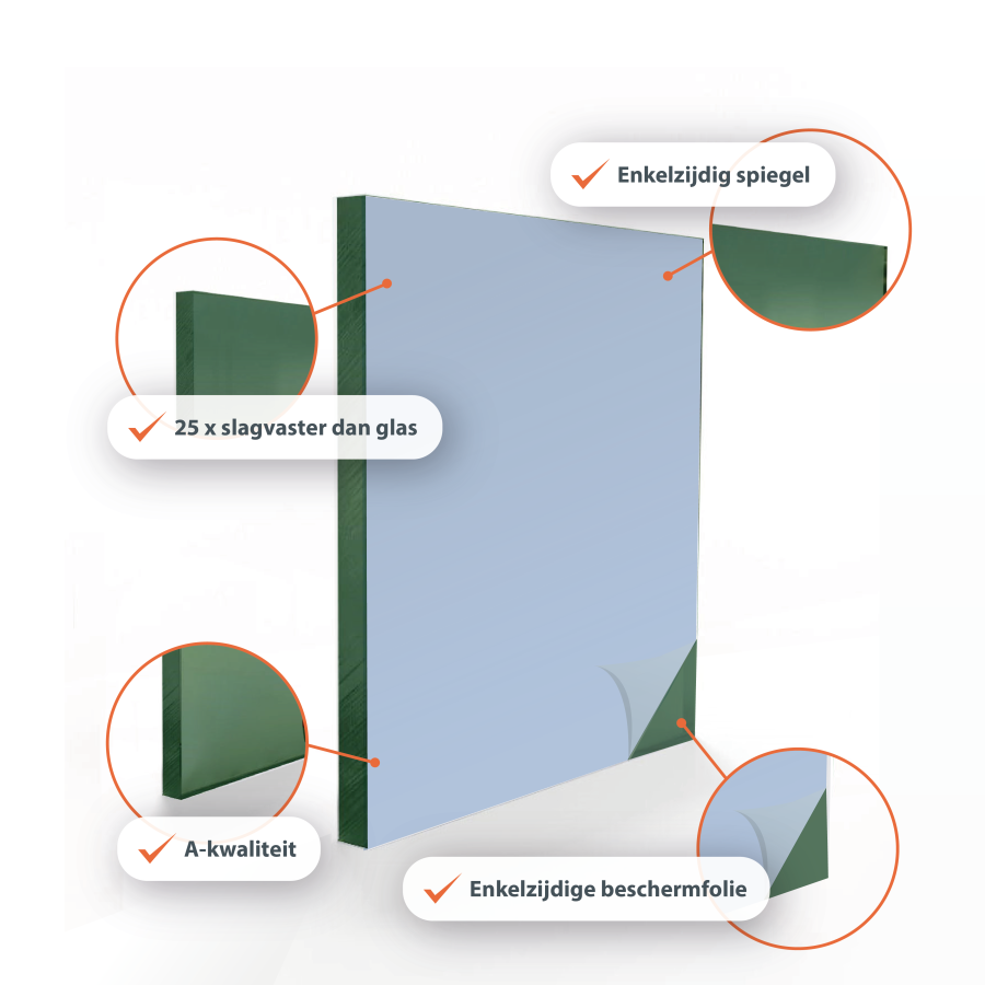 Acrylaat (Plexiglas®) spiegel is dé lichte en onbreekbare vervanger van glas. Tot wel 25 keer slagvaster en de helft lichter dan glas. Perfect voor toepassingen waar gewicht of veiligheid belangrijk is, zoals interieurs of decoratieve projecten.