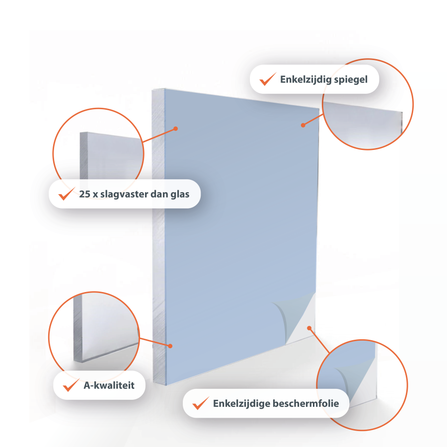 Acrylaat (Plexiglas®) spiegel is dé lichte en onbreekbare vervanger van glas. Tot wel 25 keer slagvaster en de helft lichter dan glas. Perfect voor toepassingen waar gewicht of veiligheid belangrijk is, zoals interieurs of decoratieve projecten.