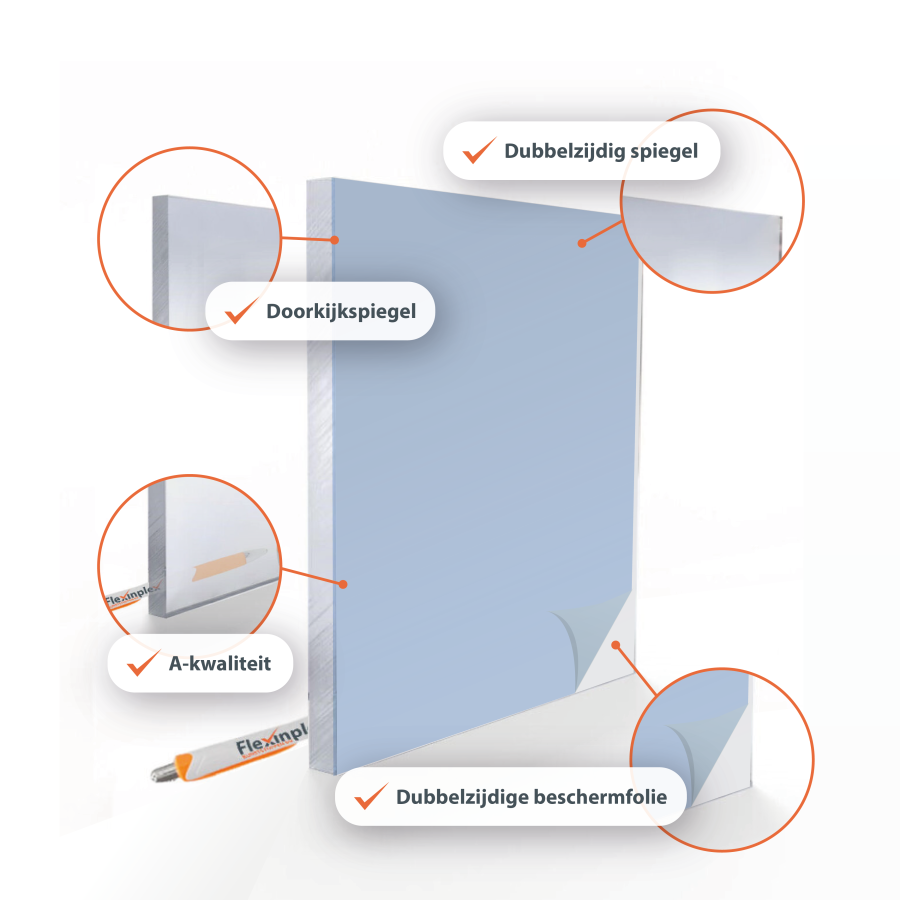Acrylaat (Plexiglas®) spiegel is dé lichte en onbreekbare vervanger van glas. Tot wel 25 keer slagvaster en de helft lichter dan glas. Perfect voor toepassingen waar gewicht of veiligheid belangrijk is, zoals interieurs of decoratieve projecten.